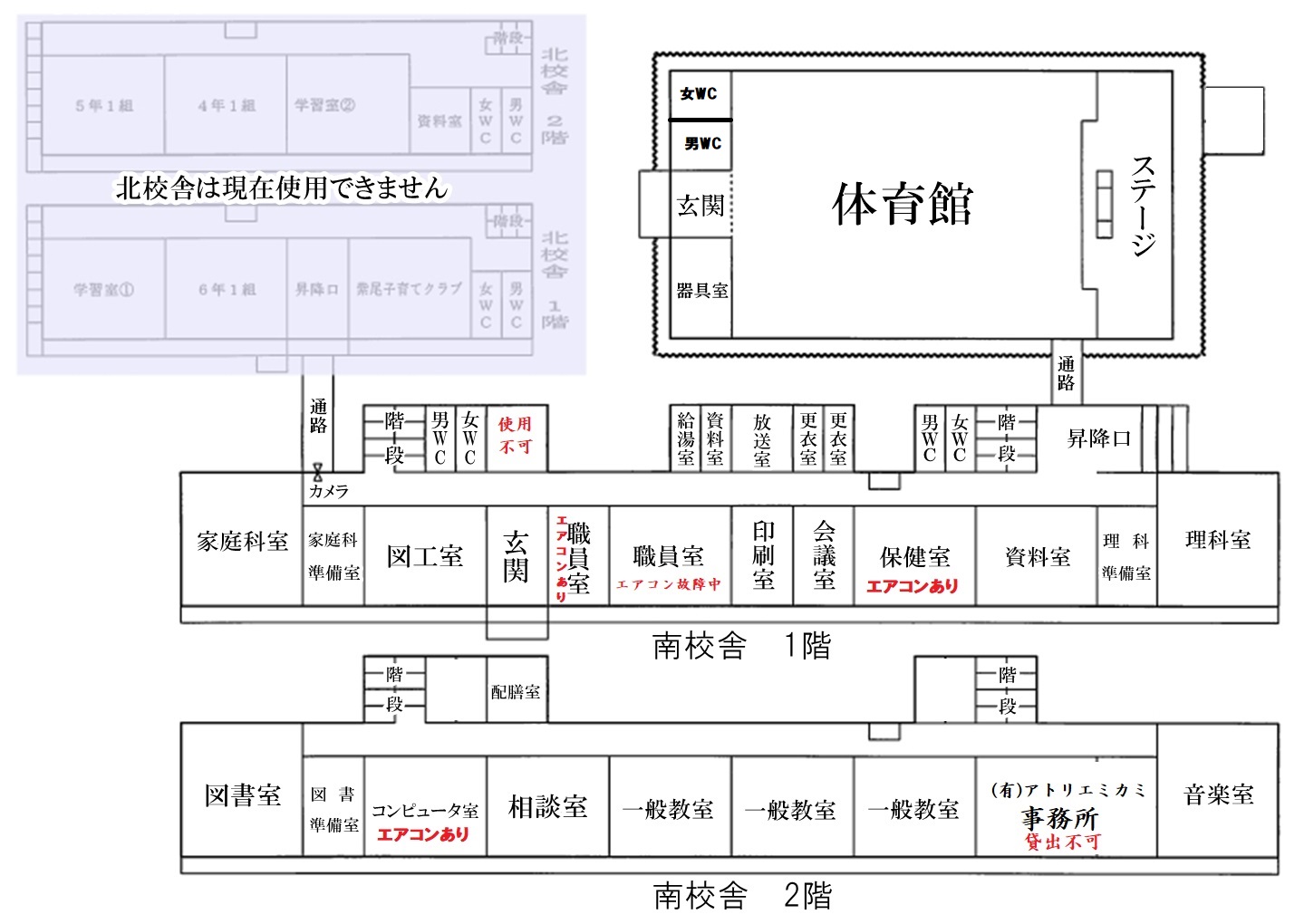 - 空調:業務用冷暖エアコン 計2台(1F:校長室 / 保健室 )故障中(1F:職員室 / 2F:コンピューター室 )